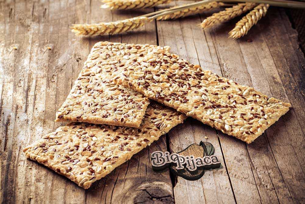 - Lan, susam, ovsene pahulje, suncokret, integralno pšenično brašno, heljdino brašno, biljna mast, morska so.