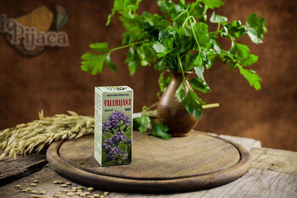 Smanjuje uznemirenost, razdražljivost, uspostavlja normalan ritam sna, otklanja strah i deluje kod poremećaja koncentracije i „nervoze srca“. Valerijanu je potrebno koristiti duže jer postepeno razvija lekovite efekte. Sastav: 30 ml alkoholno-vodenog ekstrakta rizoma sa korenjem valerijane 1:4 (Valerianae rhizoma cum radicibus). Tinctura valerianae.