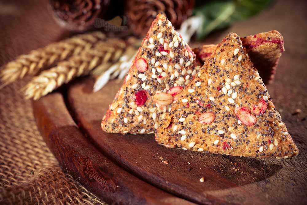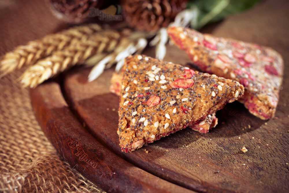 - Brašno od celog zrna pšenice (integralno brašno), fruktoza, biljna mast, ovsene pahulje, integralno ražano brašno. T950, malina min. 6%, mak, susam, đumbir, regulator kiselosti-limunska kiselina, sredstva za dizanje testa soda bikarbona i amonijum-hidrogencarbonat. emulgator-sojin lecitin, aroma maline sa veštačkim bojama E122 i E131, arome,so.