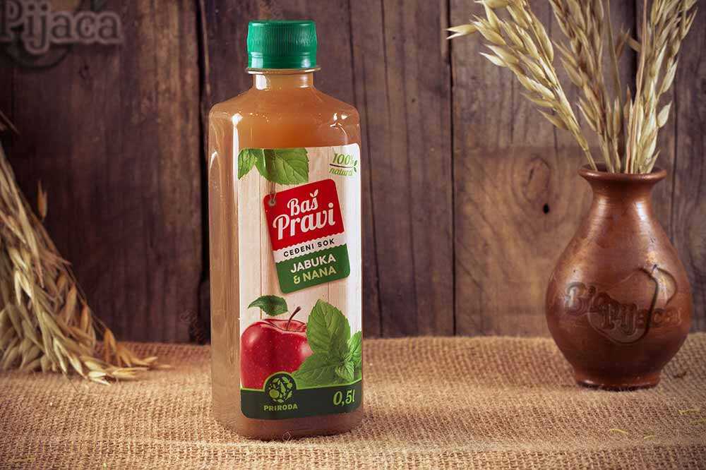 Jabuka-nana „Baš Pravi“ sok je jednostavno prelepa kombinacija lekovitog bilja i ceđenog soka jabuke. Posle samo jednog gutljaja imate osećaj da ste udahnuli čist planinski vazduh. Poboljšava varenje, smanjuje napetost, pojačava koncentraciju. Poznato je da su i jabuka i nana dobre protiv nesanice i umiruju organizam posle napornog dana.